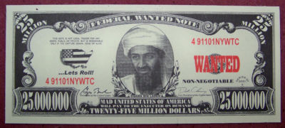 From time to time we will be offering select pieces at true NO reserve auctions for your bidding pleasure. Check back occassionally (Check out my other items!! ) to view our NEW additions, bid accordingly. All items are 100% guranteed authentic, unless otherwise noted. See description. Here we have to offer a 2011 BIN LADEN FEDERAL WANTED NOTE $25,000,000 AL-QUEDA , BUSH , CHANEY RARE. Be sure to add me to your favorites list! Be sure to add me to your favorites list! 100% authenticity guranteed. fREQUENTLY ASKED QUESTIONS: DO YOU ACCEPT RETURNS?