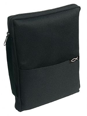 zipped mesh inner pocket with a pen loop and an outer pocket with woven fish