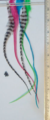 5 feather grizzly extensions that are from 9" to 11", from Whiting, premium USA raised birds. Photogragh shows the beautiful bright colored feathers and are the exact feathers you will recieve, no guessing here, no substitutions.