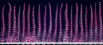 60 feather grizzly extensions that are in the 5" to 6" range (as shown in the photo), from Whiting, premium USA raised birds. All feathers are dyed using professional acid dyes which produce brighter colors and greater color fastness.