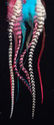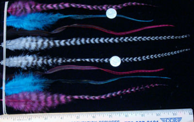 8 feather grizzly extensions that are from 10" to 12", from Whiting, premium USA raised birds. All feathers are dyed using professional acid dyes which produce brighter colors and greater color fastness.