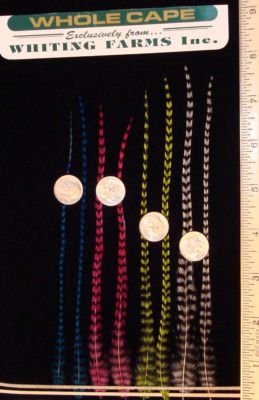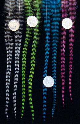 8 grizzly feathers for extensions each are in the 6 1/2" to 8" range. They are all from Whiting, premium USA raised birds. All feathers have been hand washed and dyed using professional acid dyes which produce brighter colors and greater color fastness.