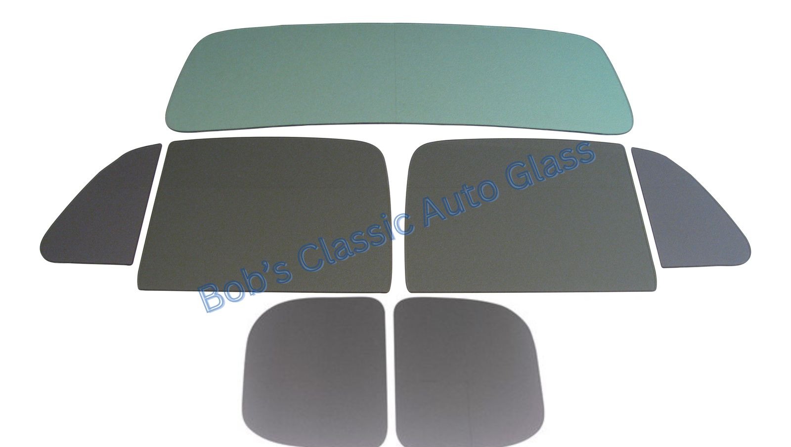windshield, 2 vent windows, 2 doors, and the 2 back windows.