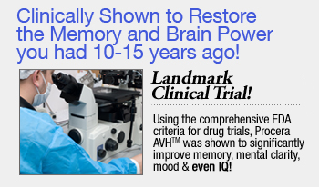 Procera AVH was developed over 20 years by a team of cognitive and neuro- scientists, as a safe and natural supplement to boost oxygen and neuro-transmitter levels, and protect your brain against the ravages of aging, poor diet, alcohol, stress and environmental toxins.” |