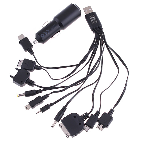Powerful Car Charger with 10 connectors, compatible with iPhone 3Gs/iPhone 4, Motorola V3/V8, NOKIA 6101/8210, Samsung D800/i900, Sony Ericsson MK750, LG KG90, PSP, and more.