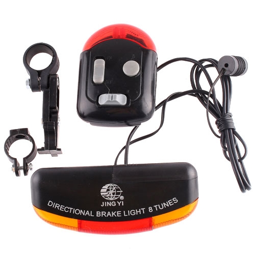 3-in-1 Bicycle Turn Signal Brake 7 LED Light with horn Left / right directional control switches 7 super bright LED (Left / right: 2 LED, Middle: 3 LED) 8-tune Horn: An integration of the 8-sound horn Light Model: Turning light, break light Keeping your safety in the darkness and early morning Ideal for outdoor activities, like biking / hiking Powered by two AA batteries(not included) Lowest power consumption It has seven super bright flash light, such as a red braking, a pilot light and a yellow direction light, very convenient to use. The horn sounds while turning. Dimensions: Turning Light: 130*52*37mm, Horn: 80*50*28mm Control Wire Length: Horn to turn signal light: 112cm Break switch to turn signal light: 45cm Package Included: 1* bike turn signal brake LED light 1* horn 1* fixed mount