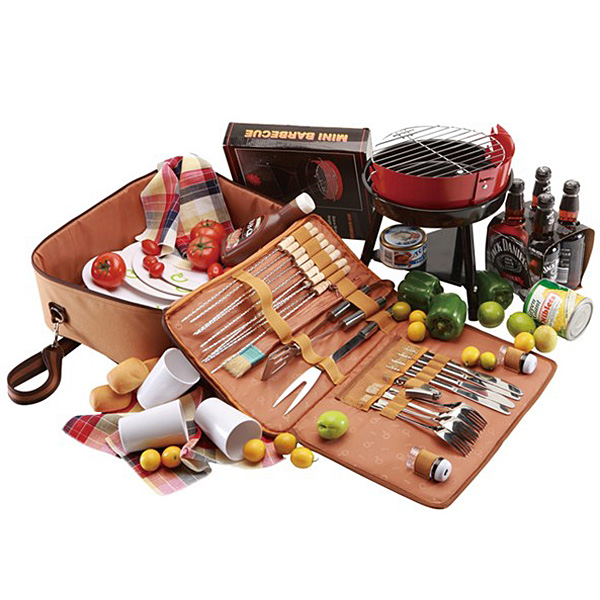 Including detachable barbecue grill set, grill brush, tong & kabob skewers.