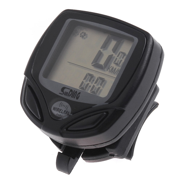 Wireless bicycle speedometer with LCD display.