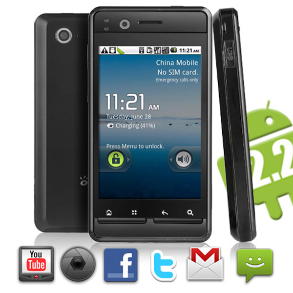| Operation System | Google Android 2.2 | | CPU | Qualcomm MSM7227 (800MHz) | | Band | WCDMA 2100 ( DL 7.2Mbï¼UL384Kb),not supporting CDMA 2G GSM/GPRS/EDGE 850/900/1800/1900 | SIM Card Slot | SIM Card 1 WCDMA(3G) & GSM/GPRS/EDGE | | SIM Card 2 GSM/GPRS/EDGE | | Memory | Internal memory: 512MB | | T-Flash card slot Max. up to 32GB (T-Flash card not included) | | Screen | 3.5" TFT LCD | | Multi-Touch capacitive panel | | Resolution: 480*320Â Display color: 262K | | Data Transfer & Internet | Data Transfer: USB & Bluetooth 2.0 | | Mobile Internet: WAP & WiFi(IEEE 802.11b/g) | | Support GPRS | | Camera | Back: 2MP | | Front: 0.3MP | | Support Format | Ringtones Type: Polyphonic/MP3 | | Audio Format: MP3, WAV, OGG, AMR, MIDI, AAC | | Video Format: MPEG4, 3GP2, WMV, H.264, H.263 | | Image Format: JPEG/BMP/GIF | | E-book Format: TXT, PDF | | FM Radio: Yes | | Other Function | Call Record | | Phonebook: 1000 Entries | | Messaging: SMS/MMS | | Email: POP3/SMTP/IMAP4 | | G-sensor | | GPS | | Compass | | Support Soft | Gmail, Gtalk, Skype, YouTube, Facebook, Twitter, Android market, Game, etc | | Battery | Li-ion,1350mAh, 3.7V | | Battery life: 48 hours (idle mode) | | Interface | 1 * Micro-USB | | 1 * 3.5mm Line-out/Headphone | | Certification | FCC, CE | | Language | Bulgarian, Catalan,Czech, Danish, German, English (UK), English (US), Spanish, Spanish(US), French, Hebrew, Hindi, Hrvatski, Indonesian, Italian, Japanese, Lithuanian, Magyar, Dutch, Norwegian, Polish, Portuguese (Brazil), Portuguese (Portugal), Slovenian, Suomi, Svenska, Tagalog, Turkish, Vietnamese, Greek, Russian, Arabic, Thai, Korean, Simplified Chinese, Traditional Chinese. | | Other | Color: Black | | Body size: 11.7 * 6.1 * 1.4cm | | Package size: 15 * 9 * 6cm | | Body weight: 86g | | Package weight: 256g | | Adapter Input: 100-240V 50/60Hz | | Adapter Output: 5V 0.5A | | Adapter Plug: US | | Accessory | 1 * Power adapter | | 1 * USB cable | | 1 * Headphone | | 1 * Micro SIM adapter | | 1 * Li-ion battery | | 1 * User manual | |