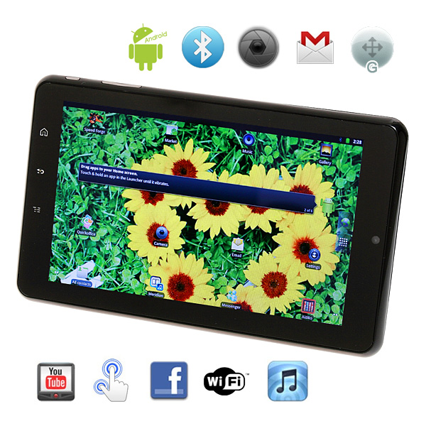 | Operation System | Google Android 2.3 | | CPU | TI OMAP3 Cortex A8 Triple-core processors 1GHZ, support Adobe Flash 10.3 | | Memory | RAM 512MB | | Hard disk 4GB | | Support T-Flash card up to 32GB(T-Flash card not included) | | Screen | 7" LCD widescreen | | 2 points sensitive capacitive touch screen | | 1024*600 high definition (16:10) | | WiFi & Bluetooth | WIFI: IEEE802.11b/g/n wireless network | | Support Bluetooth | | Camera | 0.3MP Front Camera | | Audio | Support MP3, WAV, etc | | Video | Support AVI, MPEG2, MPEG4, RMVB, WMV, etc | | Picture | JPG, BMP, GIF, PNG | | Speaker | Stereo speaker | | Stereo headphone output | | Battery | Lithium 3000mAh | | Battery life: 5 hours (idle mode) | | Interface | 1 * Mini USB (OTG) | | 1 * Standard USB 2.0 | | 1 * DC in | | 1 * 3.5mm Line-out/Headphone | | 1 * TF card slot | | Button | Volume Control | | Power Button | | Home Button | | Shortcut Button | | Return Button | | Language | Arabic, Hebrew, Czech, Dansk, German, English, Spanish, French, Italian, Dutch, Norwegian, Polish, Portuguese, Sweden, Turkish, Greek, Russian, Korean, Simplified Chinese, Traditional Chinese, Japanese. | | Support soft | Browser, Email, Office, Gallery, Android Market, Video, Game, etc | | Other | Color | Black | | Material | Plastic | | Size | Item size: 19.5 * 12 *1.6cm | | Package size: 22 * 14.7 * 10cm | | Weight | Item weight: 385g( with battery) | | Package weight: 632g | | Adapter | Input | 100-240V 0.35A | | Output | 5V 1.5A | | Plug | US | | Package including | Tablet PC | | Power Adapter | | User Manual | |