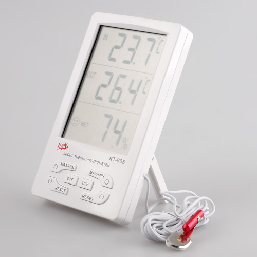 This product has the following key features: high stability & accuracy, low power consumption, multi-function, large LCD display.It can truly reflect the situation of environment around. Features: Display temperature,humidity and time at the same time Sampling measures at random Memory of MAX&MIN measuring value 12-hour/24-hour system optional °C/°F temperature unit selectable Alarm clock&Calendar function Desk placing or wall hanging With the white test sensing cable, it can measure surface temperature and humidity of the objects Specifications: Model: KT-905 Housing material: ABS plastic Screen size: 4.5 inch approx Temperature range: -10°C~50°C/14°F~122°F(indoor) -50°C~70°C/-58°F~158°F(outdoor) Humidity range: 20%~99%RH Resolution: temperature:0.1°C(0.1°F) humidity: 1%RH Accuracy: temperature: ± 1°C(1.8°F) humidity: ±5%RH(40%-80%) Storage condition:-20°C-60°C Buttons: MODE, ADJ, MAX/MIN, RESET, °C/°F Power supply: 1pcs 1.5V AAA battery(included) Dimension:150*90*25mm Color: white Unit net weight: 152g Unit packing gross weight: 187g Package included: 1 x Digital Temperature&Humidity Clock 1 x White test sensing cable 1 x 1.5V AAA battery 1 x User manual |