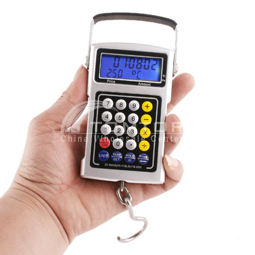 50Kg x 20g Fish Hook Hanging Digital Weighing Scale Scale max load: 50KG Scale resolution/step: 20g Scale units: KG/G/LB/TI/CA 16-digit LCD display (48*20mm)br />Powered by 2 x AAA batteries (Not included) Features a 100cm long retractable measuring tape Built-in 7 in 1 Function: calculator, digital thermometer, time display, tape function, weighing, weigh belt and unit price calculating Calculator features automatic price calculation based on weight measured by the digital scale Waterproof keyboard Length of weight belt: 100cm Dimensions: 10.7 x 6.5 x 2.6cm Weight: 175g