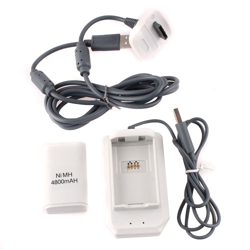 Battery charger, battery, controller ectension cable It can protect your for 360 Controller with secure cicuitry It has overcharge protecting. Battery: Color: white Capacity: 4800 mAh Battery Output: DC 2.4V Battery can also be charged through any USB port, included the USB port on the xBox 360 console Battery charger Color:white Red / Green LED charging indicator lights Recharge the battery pack by using USB Connection Connects to XBOX 360 console or anything with a USB port