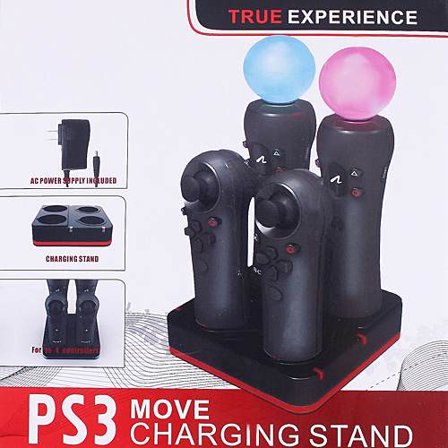 Features: * All in One: Special charging stand for PS3 MOVE with 4-sockets, can charge 2 Left-Hand controllers and 2 Right ones at the same time. * Easy Operation: Place the PS3 MOVE controllers into the charging sockets, connect the charger with the provided power adaptor, and it begins to work. * Quick Charging: 2.5 hours for Navigation controllers, 4.5 hours for Motion controllers. * LED Indicators: Indicate charging status. * Fashionable Design: Modern black, decent line. * High Quality. * Best Price. * Compact Design.