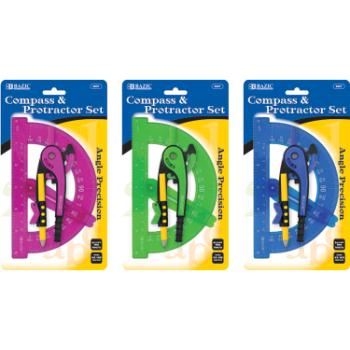 BAZIC Scale-Arm Compass w/ #2 Wood Pencil & 6"" Protractor Set - Scale-arm compass features easy to read graduation arc in both inches and metric. - Makes circle to 12"" diameter. - Includes 3 1/2"" # 2 HB pencil. - Safe blunt metal tip compass is perfect for any student. It is one of the safest compass. - Come in assorted color combinations. - Semicircular 6"" protractors feature pivoting arm for easy measuring at any angle. - Center cut out for easy finger lift." Case Pack 144 Please note: If there is a color/size/type option, the option closest to the image will be shipped (Or you may receive a random color/size/type).