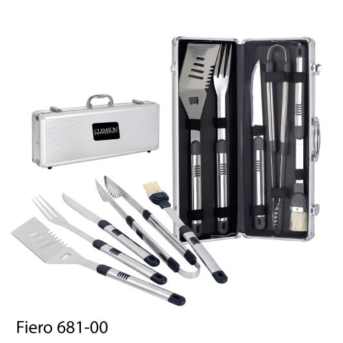The Fiero Set from our Platinum Collection contains the essentials you'll need to prepare a phenomenal barbeque feast. The Fiero 5 Piece Barbeque Set features an attractive aluminum carrying case with comfort-grip handle, large eyelets allow you to hang the BBQ tools, faux leather interior and elastic-reinforced hook and loop closures to keep tools secure. Includes: 1 Extra large stainless steel spatula with serrated edge and built-in bottle opener, 1 Large stainless steel BBQ fork, 1 Large stainless steel BBQ knife, 1 Stainless steel tongs, 1 Basting brush. Color: Black. Decoration: Laser Engraving." Case Pack 2 Please note: If there is a color/size/type option, the option closest to the image will be shipped (Or you may receive a random color/size/type).