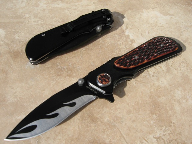 The 3-1/4" 440 stainless steel blade is black with flames and its razor