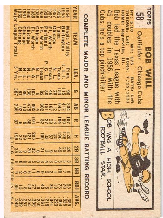 Item Details Set: 1963 Topps Player: Will, Bob Team: Chicago Cubs Sport: Baseball Brand: Topps Manufacturer: Topps Co.