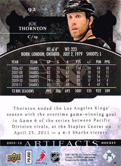 Item Details Set: 2011-12 Artifacts Player: Thornton, Joe Team: San Jose Sharks Sport: Hockey Brand: Artifacts Manufacturer: Upper Deck Co.
