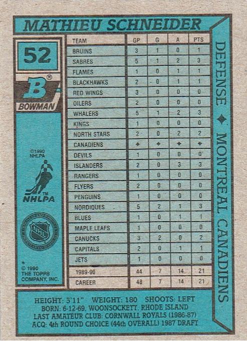 1990-91 Bowman #52 Mathieu Schneider Rookie Card