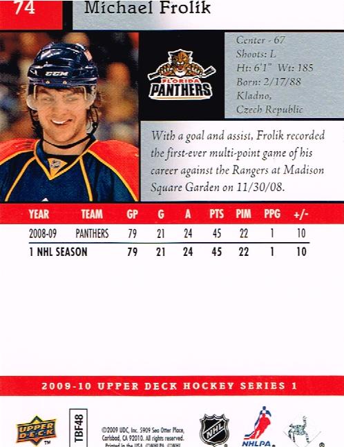 Item Details Set: 2009-10 Upper Deck Player: Frolik, Michael Team: Florida Panthers Sport: Hockey Brand: Upper Deck Manufacturer: Upper Deck Co.