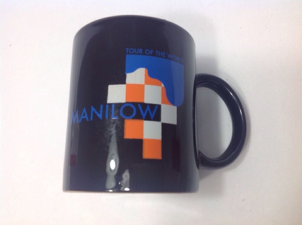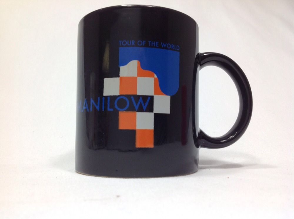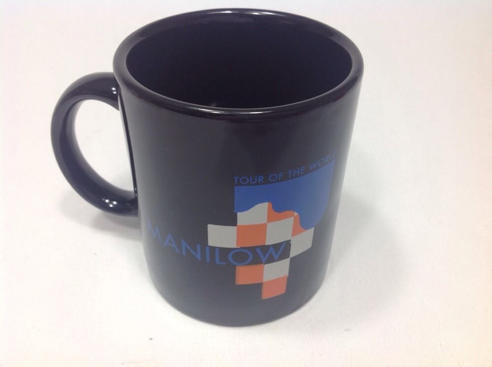 Barry Manilow Tour of the World logo concert mug from 1997. I purchased this mug for my collection and it was never used. Measures 3.75" tall. Looks great, in new condition. Barry Manilow Concert Mug Tour of the World Logo on Black Coffee Tea Mug 1997