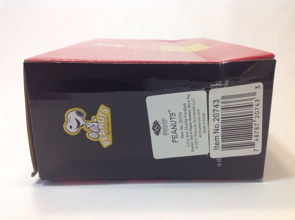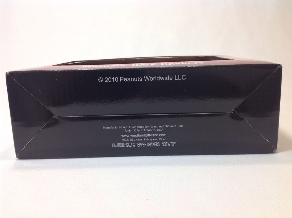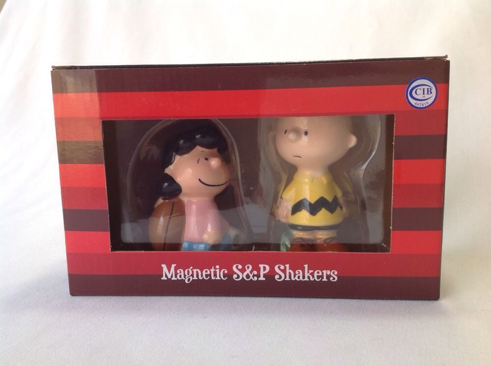 New in box Lucy and Charlie Brown salt and pepper shakers. The back of the box has a dent in it. The inside is fine but the box got dented when it was shipped to me. Shakers have a nice shinny ceramic finish and have a small magnet that attract them to each other. 3.75" tall, Westland, 20743, Ships Priority Mail in the US