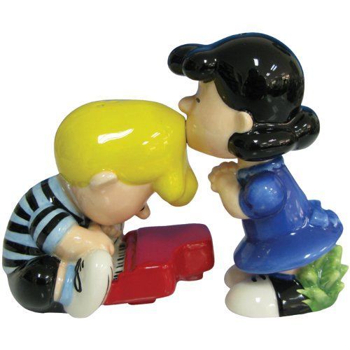 New in box Lucy kissing Schroeder on his head while he plays his piano, salt and pepper shakers. This cute set that stands about 3.5" tall. Shakers have a nice shinny ceramic finish and a small magnet that attract them to each other. Ships Priority Mail in the US. Westland 18279