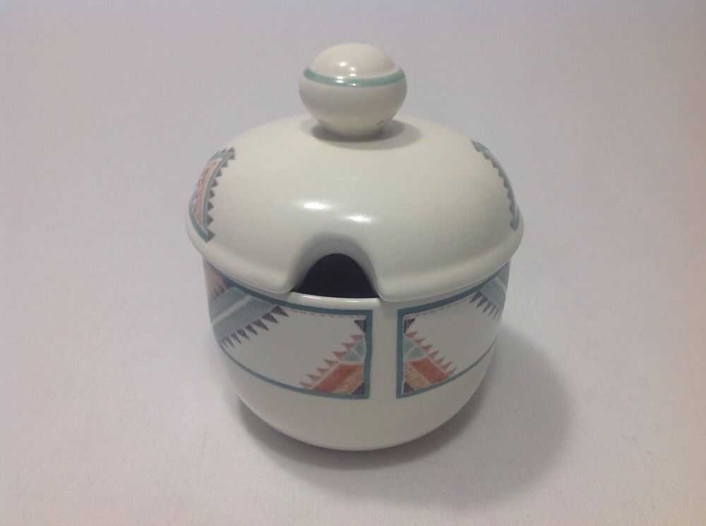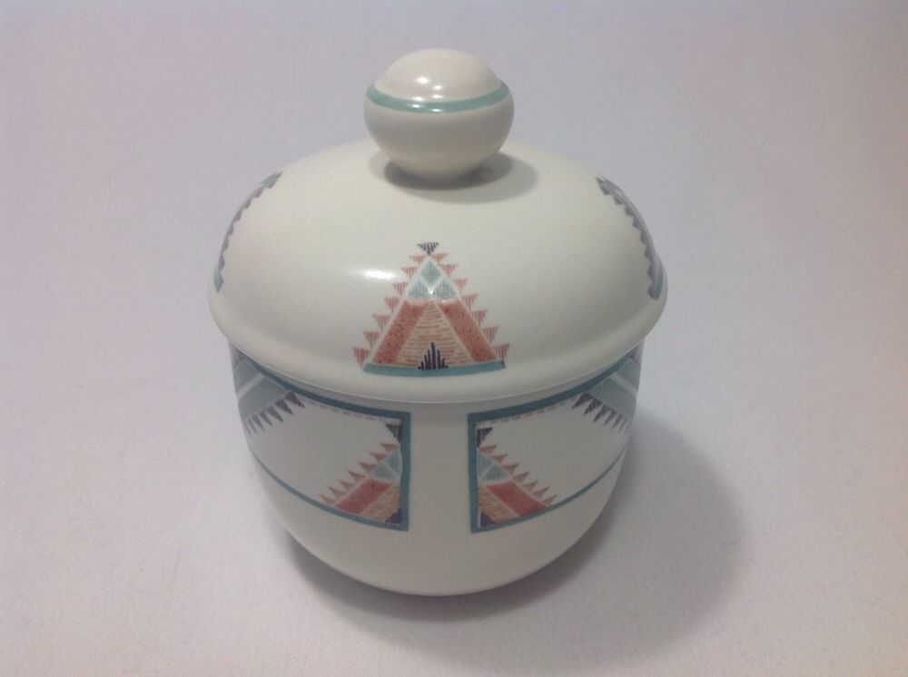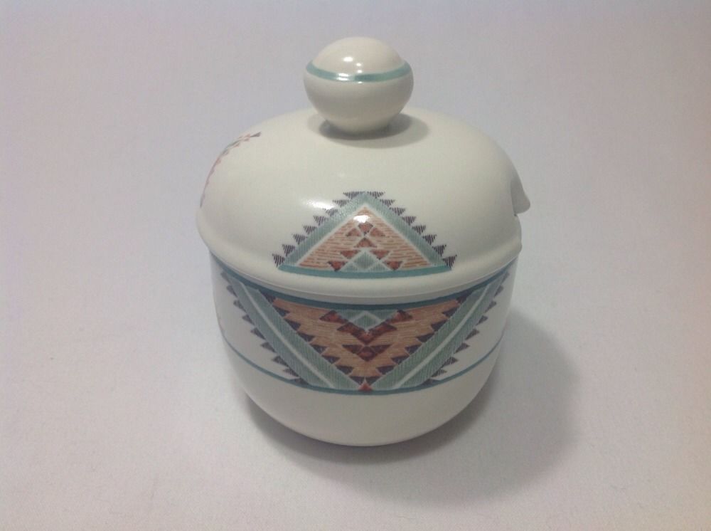 Mikasa Intaglio Santa Fe CAC24 Jam and Jelly with lid. Discontinued pattern, active from 1987 - 2000. It was never used. I purchased, washed, and stored it. About a total of 4" tall.