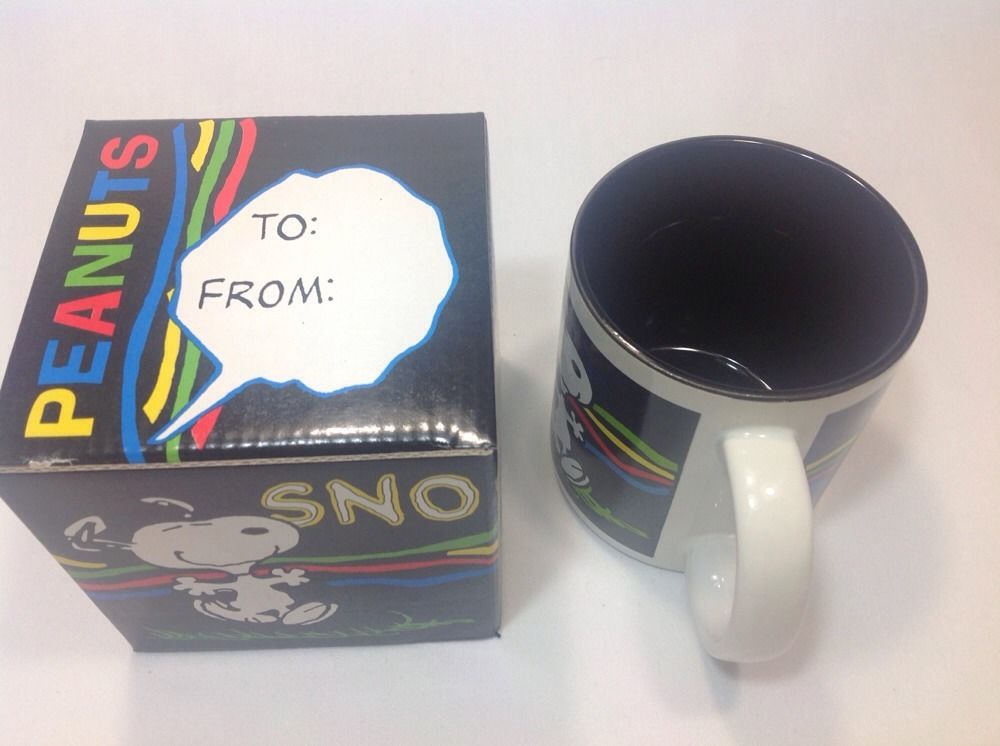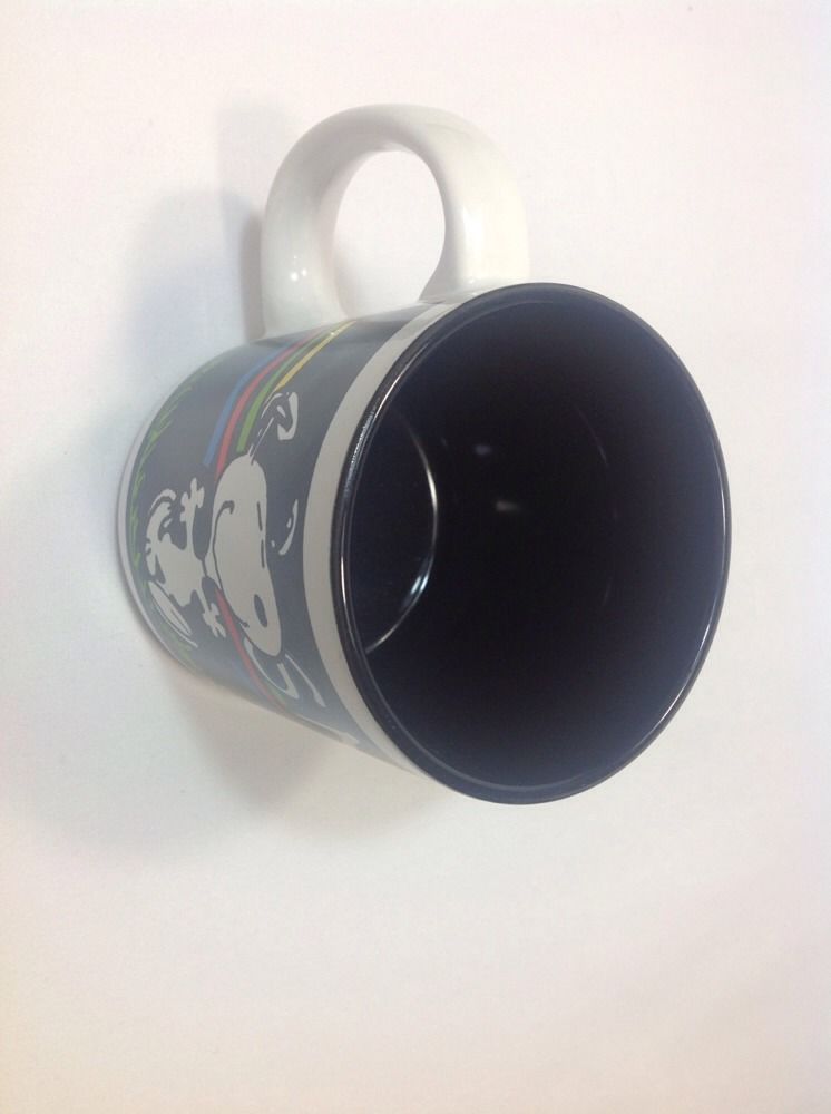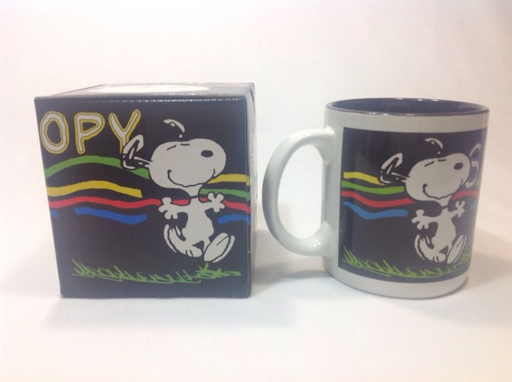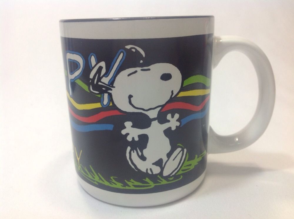 Snoopy dancing over a black background ceramic mug. Mug is new in gift box, never used from 1994. 3.75" tall and 3.25" across. Bottom reads dishwasher and microwave safe.