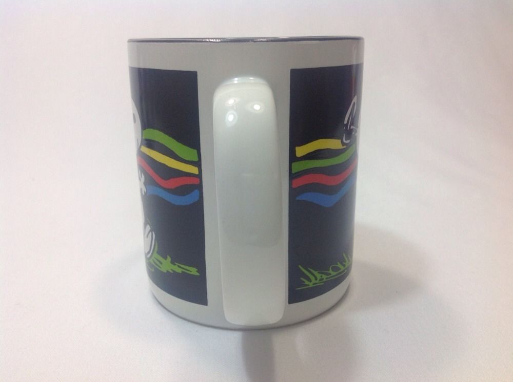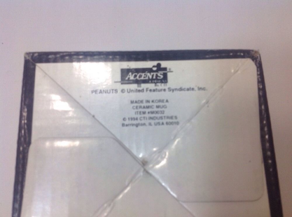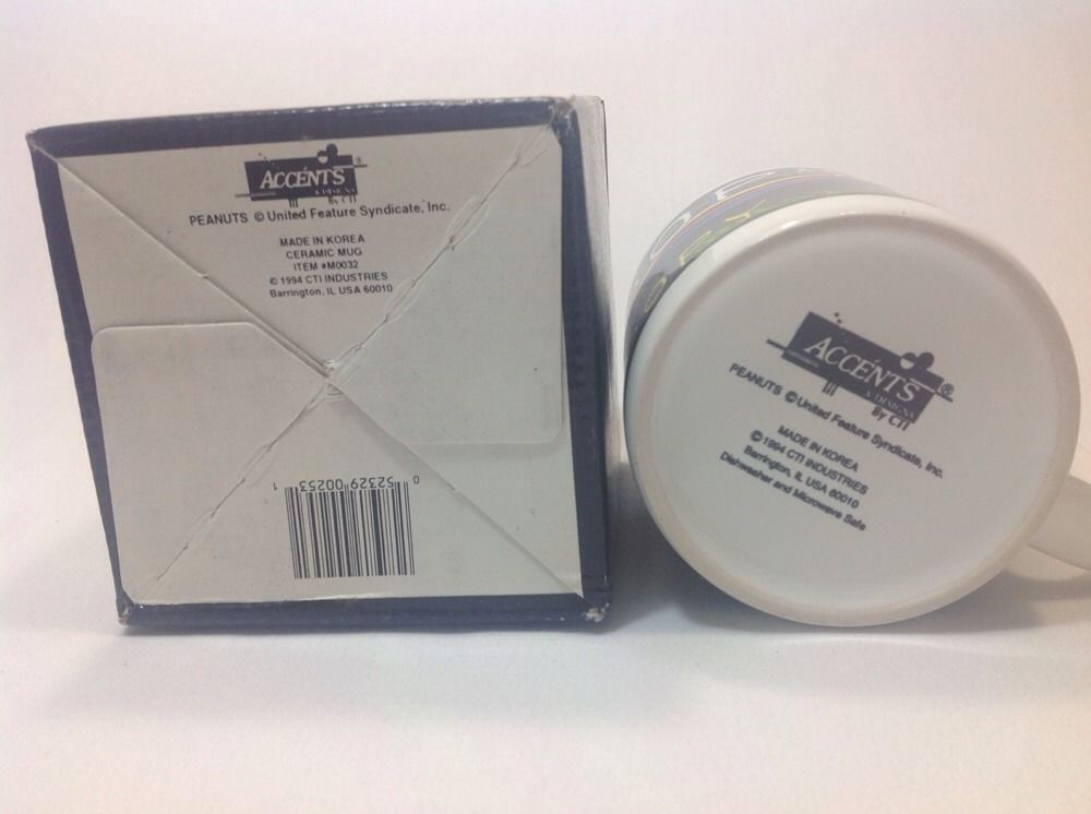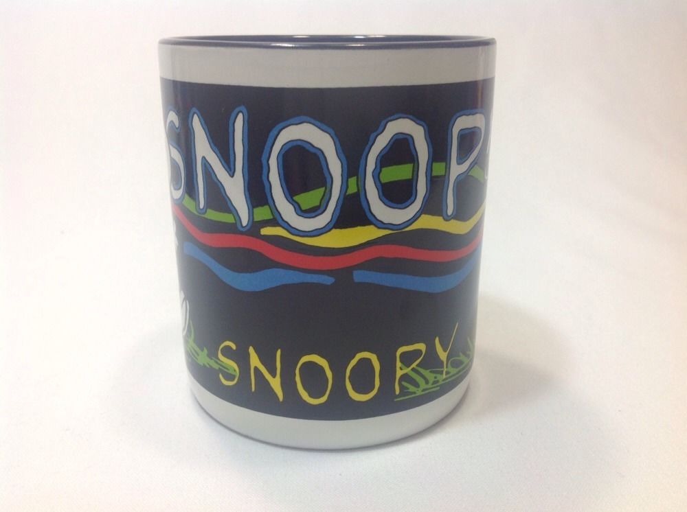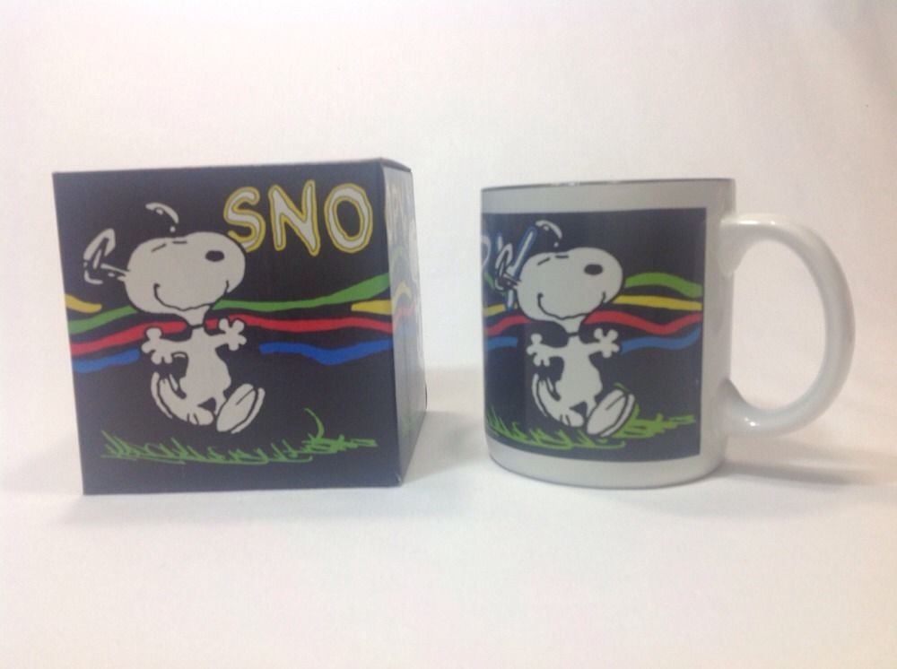Snoopy dancing over a black background ceramic mug. Mug is new in gift box, never used from 1994. 3.75" tall and 3.25" across. Bottom reads dishwasher and microwave safe.