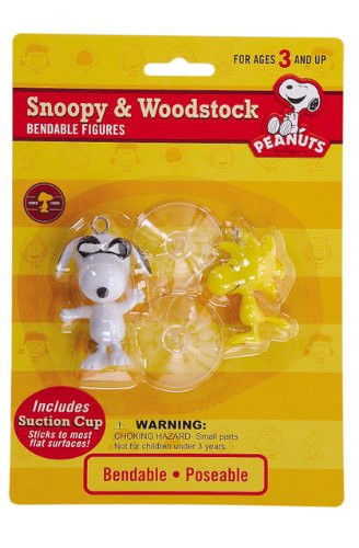 Snoopy as Joe Cool and Woodstock bendable and poseable figures with suction cups. Made of rubber type of material, Snoopy is about 3" tall and Woodstock about 2". For ages 3 and up. Peanuts by Charles Schulz.