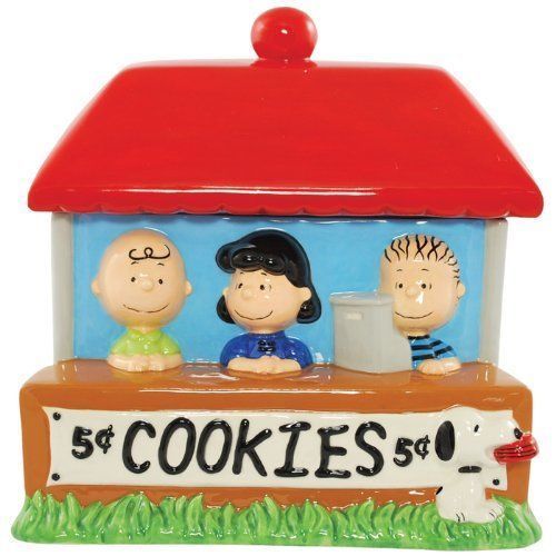 Peanuts Cookie Stand ceramic cookie jar featuring Snoopy, Charlie Brown, Lucy and Linus. Stands about 8.25" tall and 8.5" across. Comes in original box but the box was dented in shipping. The jar is fine but the outer box is not perfect.