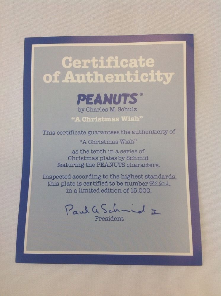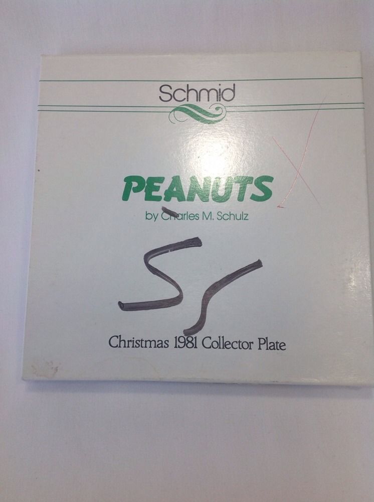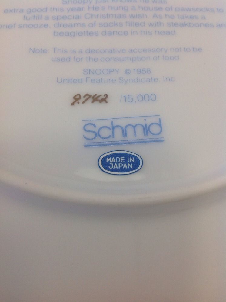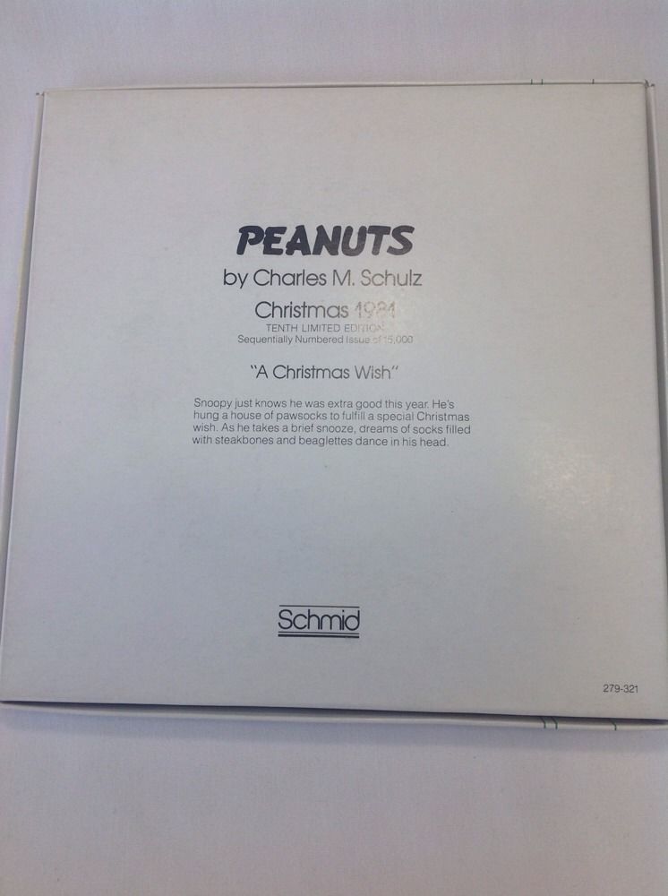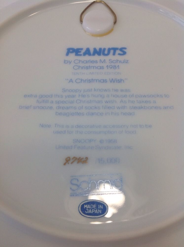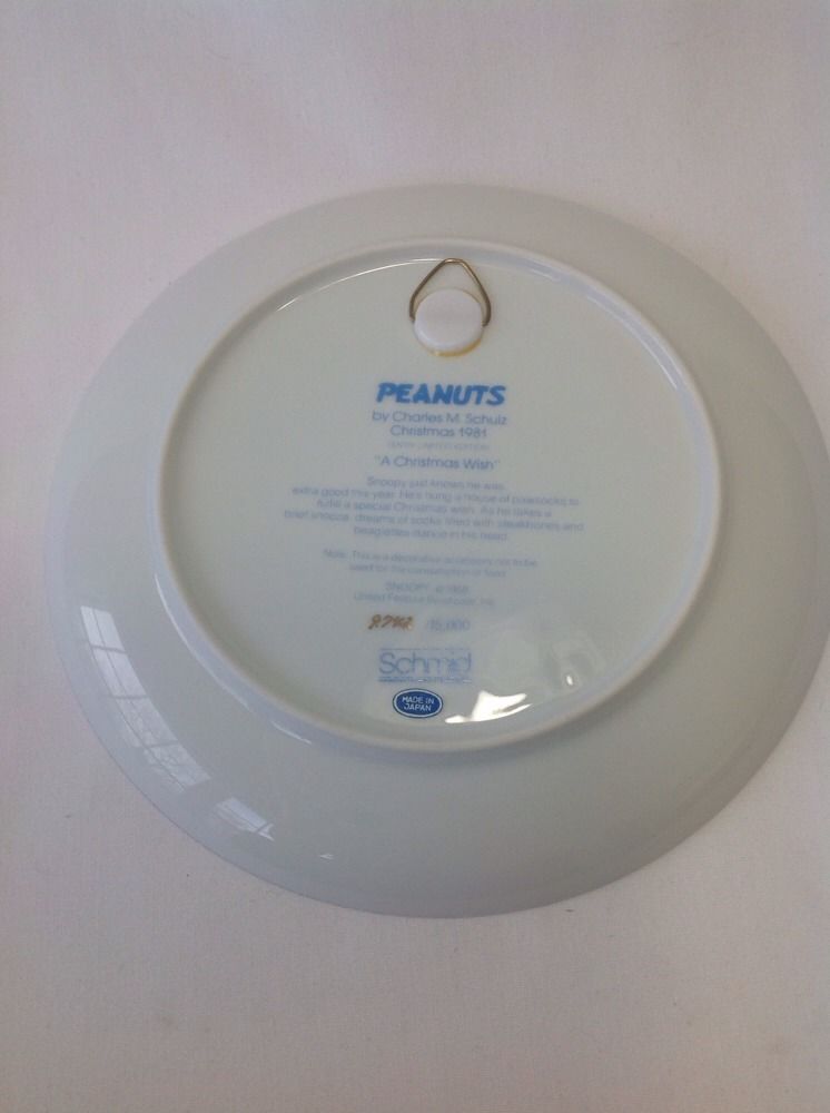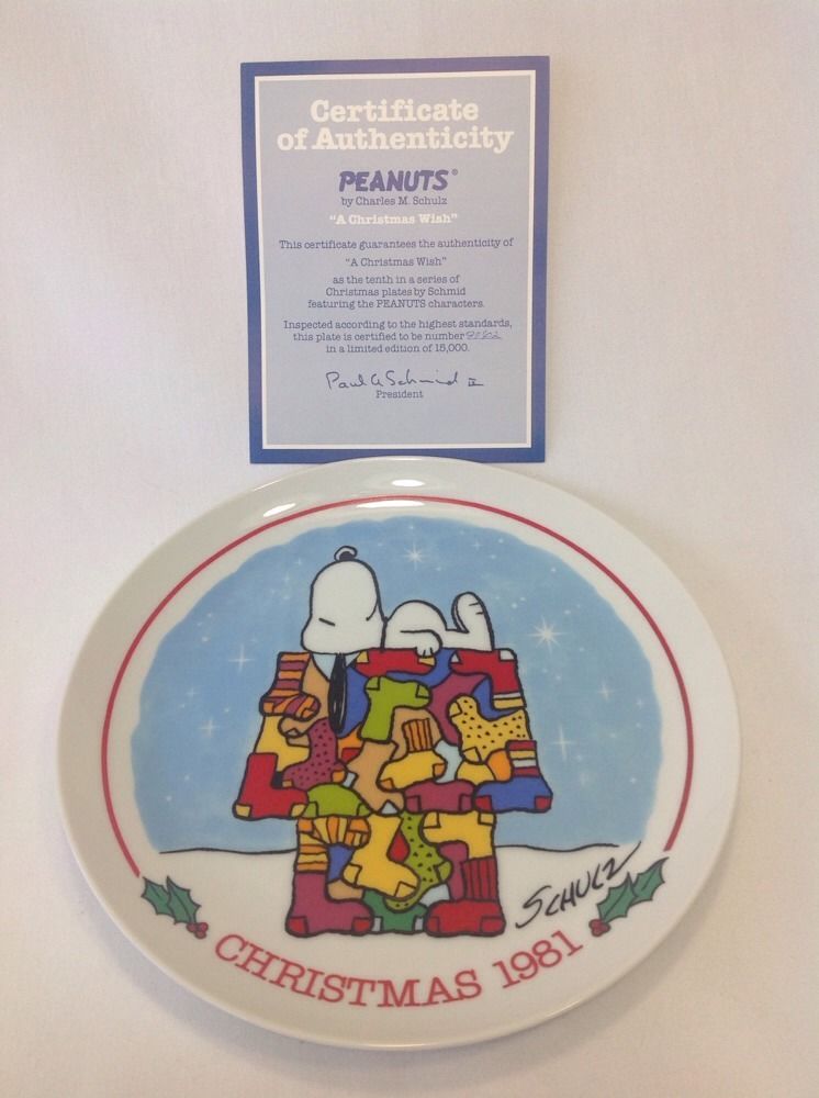 Peanuts Snoopy Collectible Ceramic Plate Christmas 1981 Schmid Schulz With Box. Comes with Certificate of Authenticity, # 9742 out of 15,000. Box does have some wear and has writing on it.