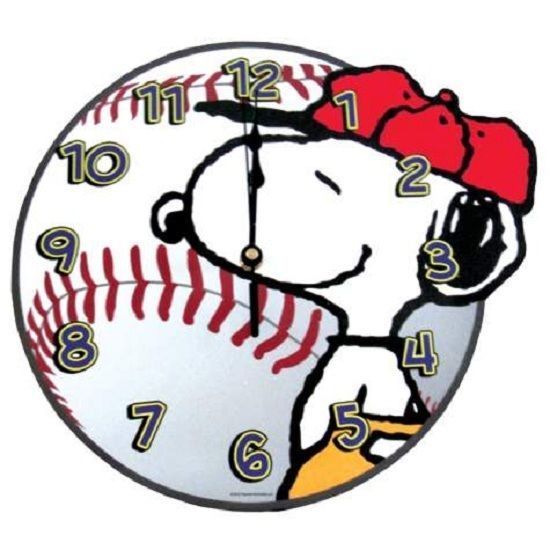 Peanuts Snoopy baseball wall clock, 10.5" tall. Snoopy wears a baseball cap and glove. Officially licensed by Westland 20794.