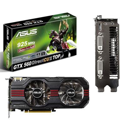 ENGTX560 DCII TOP/2DI/1GD5; Graphics Engine GeForce GTX560; Bus Standard PCI Express 2.0; Video Memory 1G GDDR5; Engine Clock 925 MHz; CUDA Cores 336; Shader Clock 1850 MHz; Memory Clock 4200MHz (1050MHz GDDR5) ; Memory Interface 256 bit; DVI Max. Resolution 2560 * 1600; DSub Max. Resolution 2048 * 1536; D-sub Output 1 x DVI-to-D-sub adaptor; DVI Output 2 x DVI-I; HDMI Output 1x Native HDMI (Mini HDMI); HDCP compliant YES; Accessory bundled 1 x mini HDMI-to-HDMI adaptor 1 x DVI-to-D-sub adaptor 1 x Power Cable
