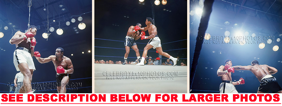 YOU ARE PURCHASING 3 CANDID & RARE MUHAMMAD ALI 1965 SONNYLISTON FIGHT (3) 8x10 FINE ART PHOTOS The (3) 8x10 Candid & Fine Art Photos you will receive, (shown below) are from a Private Collection. COPYRIGHTS: (please see bottom of thispage) These Candid, One of a kind pictures are Professionally photo-printed utilizing the GICLEE printing process onto GALERIE SmoothGloss Archival & Acid-free High Resolution Photo-Lab quality paper. As well, we use only Giclee pressheated Archival Printing Inks. This is Kodak's most expensive Ink, which creates higher & more vivid quality Photos & longer lasting prints than any other Photographic Ink in the world!! This Ultra Premium Kodak Super Color/Photo Gloss Pigment Based Printing Ink also shields photos from the key factors that lead to fading such as light, air, pollution, moisture and heat. This is due to the Spectacularly Innovative "colorlast" technology applied to this KodakPIGMENTInk, which allows your Photos to virtually resist any picture fading for at least 100 years. Meaning, the vibrant colors in the Photos you see below will be the exact same vibrant colors your descendants will see when viewing your Photos 100 years from now! NOTE PLEASE** WE ARE ALWAYS LISTING DIFFERENT MUHAMMAD ALI PHOTOS & PHOTO CREATIONS. IFYOU WOULD LIKE TO BE NOTIFIED THE NEXT TIME WE LIST MORE UNIQUE AND DIFFERENT PHOTOS OF MUHAMMAD ALI PLEASE EMAIL US  8x10 PHOTO#1 8x10 PHOTO#2 8x10 PHOTO#3 CLICK HERE TO VIEW MORE MUHAMMAD ALI 8x10PHOTOS!