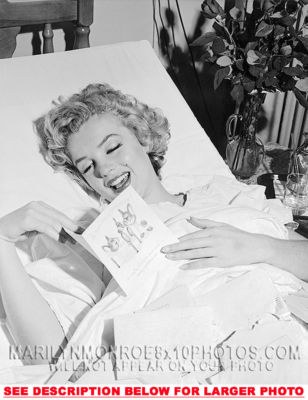 YOU ARE PURCHASING 1 CANDID & RARE MARILYN MONROE GET WELL SOON CARD (1) 8x10 FINE ART PHOTO The (1) 8x10 Candid & Fine Art Photo you will receive, (shown below) is from a Private Collection. COPYRIGHTS: (please see bottom of thispage) This Candid, One of a kind picture is Professionally photo-printed utilizing the GICLEE printing process onto GALERIE SmoothGloss Archival & Acid-free High Resolution Photo-Lab quality paper. As well, we use only Giclee pressheated Archival Printing Inks. This is Kodak's most expensive Ink, which creates higher & more vivid quality Photos & longer lasting prints than any other Photographic Ink in the world!! This Ultra Premium Kodak Super Color/Photo Gloss Pigment Based Printing Ink also shields photos from the key factors that lead to fading such as light, air, pollution, moisture and heat. This is due to the Spectacularly Innovative "colorlast" technology applied to this KodakPIGMENTInk, which allows your Photo to virtually resist any picture fading for at least 100 years. Meaning, the vibrant colors in the Photo you see below will be the exact same vibrant colors your descendants will see when viewing your Photo 100 years from now! NOTE PLEASE** WE ARE ALWAYS LISTING DIFFERENT MARILYN MONROE PHOTOS & PHOTO CREATIONS. IFYOU WOULD LIKE TO BE NOTIFIED THE NEXT TIME WE LIST MORE UNIQUE AND DIFFERENT PHOTOS OF MARILYN MONROE PLEASE EMAIL US  8x10 PHOTO#1 CLICK HERE TO VIEW MORE MARILYN MONROE 8x10PHOTOS!