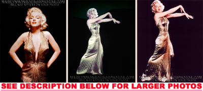YOU ARE PURCHASING 3 CANDID & RARE MARILYN MONROE GOLD LAME DRESS SHOOT (3) 8x10 FINE ART PHOTOS The (3) 8x10 Candid & Fine Art Photos you will receive, (shown below) are from a Private Collection. COPYRIGHTS: (please see bottom of thispage) These Candid, One of a kind pictures are Professionally photo-printed utilizing the GICLEE printing process onto GALERIE SmoothGloss Archival & Acid-free High Resolution Photo-Lab quality paper. As well, we use only Giclee pressheated Archival Printing Inks. This is Kodak's most expensive Ink, which creates higher & more vivid quality Photos & longer lasting prints than any other Photographic Ink in the world!! This Ultra Premium Kodak Super Color/Photo Gloss Pigment Based Printing Ink also shields photos from the key factors that lead to fading such as light, air, pollution, moisture and heat. This is due to the Spectacularly Innovative "colorlast" technology applied to this KodakPIGMENTInk, which allows your Photos to virtually resist any picture fading for at least 100 years. Meaning, the vibrant colors in the Photos you see below will be the exact same vibrant colors your descendants will see when viewing your Photos 100 years from now! NOTE PLEASE** WE ARE ALWAYS LISTING DIFFERENT MARILYN MONROE PHOTOS & PHOTO CREATIONS. IFYOU WOULD LIKE TO BE NOTIFIED THE NEXT TIME WE LIST MORE UNIQUE AND DIFFERENT PHOTOS OF MARILYN MONROE PLEASE EMAIL US  8x10 PHOTO#1 8x10 PHOTO#2 8x10 PHOTO#3 CLICK HERE TO VIEW MORE MARILYN MONROE 8x10PHOTOS!