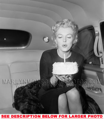 YOU ARE PURCHASING 1 CANDID & RARE MARILYN MONROE HAPPY BirthDAY IN CAR (1) 8x10 FINE ART PHOTO The (1) 8x10 Candid & Fine Art Photo you will receive, (shown below) is from a Private Collection. COPYRIGHTS: (please see bottom of thispage) This Candid, One of a kind picture is Professionally photo-printed utilizing the GICLEE printing process onto GALERIE SmoothGloss Archival & Acid-free High Resolution Photo-Lab quality paper. As well, we use only Giclee pressheated Archival Printing Inks. This is Kodak's most expensive Ink, which creates higher & more vivid quality Photos & longer lasting prints than any other Photographic Ink in the world!! This Ultra Premium Kodak Super Color/Photo Gloss Pigment Based Printing Ink also shields photos from the key factors that lead to fading such as light, air, pollution, moisture and heat. This is due to the Spectacularly Innovative "colorlast" technology applied to this KodakPIGMENTInk, which allows your Photo to virtually resist any picture fading for at least 100 years. Meaning, the vibrant colors in the Photo you see below will be the exact same vibrant colors your descendants will see when viewing your Photo 100 years from now! NOTE PLEASE** WE ARE ALWAYS LISTING DIFFERENT MARILYN MONROE PHOTOS & PHOTO CREATIONS. IFYOU WOULD LIKE TO BE NOTIFIED THE NEXT TIME WE LIST MORE UNIQUE AND DIFFERENT PHOTOS OF MARILYN MONROE PLEASE EMAIL US  8x10 PHOTO#1 CLICK HERE TO VIEW MORE MARILYN MONROE 8x10PHOTOS!