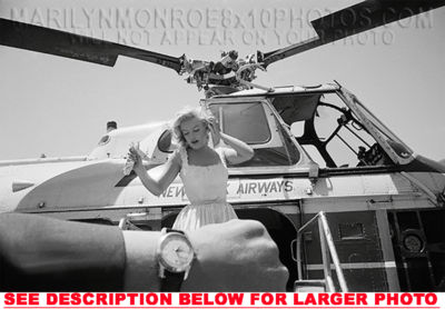 YOU ARE PURCHASING 1 CANDID & RARE MARILYN MONROE HELICOPTER EXIT (1) 8x10 FINE ART PHOTO The (1) 8x10 Candid & Fine Art Photo you will receive, (shown below) is from a Private Collection. COPYRIGHTS: (please see bottom of thispage) This Candid, One of a kind picture is Professionally photo-printed utilizing the GICLEE printing process onto GALERIE SmoothGloss Archival & Acid-free High Resolution Photo-Lab quality paper. As well, we use only Giclee pressheated Archival Printing Inks. This is Kodak's most expensive Ink, which creates higher & more vivid quality Photos & longer lasting prints than any other Photographic Ink in the world!! This Ultra Premium Kodak Super Color/Photo Gloss Pigment Based Printing Ink also shields photos from the key factors that lead to fading such as light, air, pollution, moisture and heat. This is due to the Spectacularly Innovative "colorlast" technology applied to this KodakPIGMENTInk, which allows your Photo to virtually resist any picture fading for at least 100 years. Meaning, the vibrant colors in the Photo you see below will be the exact same vibrant colors your descendants will see when viewing your Photo 100 years from now! NOTE PLEASE** WE ARE ALWAYS LISTING DIFFERENT MARILYN MONROE PHOTOS & PHOTO CREATIONS. IFYOU WOULD LIKE TO BE NOTIFIED THE NEXT TIME WE LIST MORE UNIQUE AND DIFFERENT PHOTOS OF MARILYN MONROE PLEASE EMAIL US  8x10 PHOTO#1 CLICK HERE TO VIEW MORE MARILYN MONROE 8x10PHOTOS!