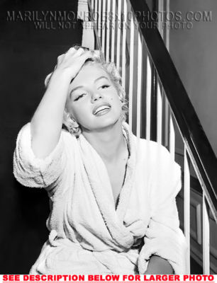 YOU ARE PURCHASING 1 CANDID & RARE MARILYN MONROE IN BATHROBE ON STAIRS (1) 8x10 FINE ART PHOTO The (1) 8x10 Candid & Fine Art Photo you will receive, (shown below) is from a Private Collection. COPYRIGHTS: (please see bottom of thispage) This Candid, One of a kind picture is Professionally photo-printed utilizing the GICLEE printing process onto GALERIE SmoothGloss Archival & Acid-free High Resolution Photo-Lab quality paper. As well, we use only Giclee pressheated Archival Printing Inks. This is Kodak's most expensive Ink, which creates higher & more vivid quality Photos & longer lasting prints than any other Photographic Ink in the world!! This Ultra Premium Kodak Super Color/Photo Gloss Pigment Based Printing Ink also shields photos from the key factors that lead to fading such as light, air, pollution, moisture and heat. This is due to the Spectacularly Innovative "colorlast" technology applied to this KodakPIGMENTInk, which allows your Photo to virtually resist any picture fading for at least 100 years. Meaning, the vibrant colors in the Photo you see below will be the exact same vibrant colors your descendants will see when viewing your Photo 100 years from now! NOTE PLEASE** WE ARE ALWAYS LISTING DIFFERENT MARILYN MONROE PHOTOS & PHOTO CREATIONS. IFYOU WOULD LIKE TO BE NOTIFIED THE NEXT TIME WE LIST MORE UNIQUE AND DIFFERENT PHOTOS OF MARILYN MONROE PLEASE EMAIL US  8x10 PHOTO#1 CLICK HERE TO VIEW MORE MARILYN MONROE 8x10PHOTOS!