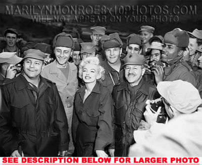 YOU ARE PURCHASING 1 CANDID & RARE MARILYN MONROE IN BETWEEN TROOPS (1) 8x10 FINE ART PHOTO The (1) 8x10 Candid & Fine Art Photo you will receive, (shown below) is from a Private Collection. COPYRIGHTS: (please see bottom of thispage) This Candid, One of a kind picture is Professionally photo-printed utilizing the GICLEE printing process onto GALERIE SmoothGloss Archival & Acid-free High Resolution Photo-Lab quality paper. As well, we use only Giclee pressheated Archival Printing Inks. This is Kodak's most expensive Ink, which creates higher & more vivid quality Photos & longer lasting prints than any other Photographic Ink in the world!! This Ultra Premium Kodak Super Color/Photo Gloss Pigment Based Printing Ink also shields photos from the key factors that lead to fading such as light, air, pollution, moisture and heat. This is due to the Spectacularly Innovative "colorlast" technology applied to this KodakPIGMENTInk, which allows your Photo to virtually resist any picture fading for at least 100 years. Meaning, the vibrant colors in the Photo you see below will be the exact same vibrant colors your descendants will see when viewing your Photo 100 years from now! NOTE PLEASE** WE ARE ALWAYS LISTING DIFFERENT MARILYN MONROE PHOTOS & PHOTO CREATIONS. IFYOU WOULD LIKE TO BE NOTIFIED THE NEXT TIME WE LIST MORE UNIQUE AND DIFFERENT PHOTOS OF MARILYN MONROE PLEASE EMAIL US  8x10 PHOTO#1 CLICK HERE TO VIEW MORE MARILYN MONROE 8x10PHOTOS!