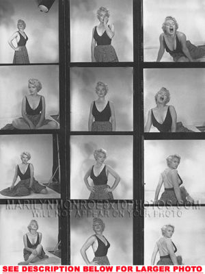 YOU ARE PURCHASING 1 CANDID & RARE MARILYN MONROE LOSTSHOOT CONTACTSHEET (1) 8x10 FINE ART PHOTO The (1) 8x10 Candid & Fine Art Photo you will receive, (shown below) is from a Private Collection. COPYRIGHTS: (please see bottom of thispage) This Candid, One of a kind picture is Professionally photo-printed utilizing the GICLEE printing process onto GALERIE SmoothGloss Archival & Acid-free High Resolution Photo-Lab quality paper. As well, we use only Giclee pressheated Archival Printing Inks. This is Kodak's most expensive Ink, which creates higher & more vivid quality Photos & longer lasting prints than any other Photographic Ink in the world!! This Ultra Premium Kodak Super Color/Photo Gloss Pigment Based Printing Ink also shields photos from the key factors that lead to fading such as light, air, pollution, moisture and heat. This is due to the Spectacularly Innovative "colorlast" technology applied to this KodakPIGMENTInk, which allows your Photo to virtually resist any picture fading for at least 100 years. Meaning, the vibrant colors in the Photo you see below will be the exact same vibrant colors your descendants will see when viewing your Photo 100 years from now! NOTE PLEASE** WE ARE ALWAYS LISTING DIFFERENT MARILYN MONROE PHOTOS & PHOTO CREATIONS. IFYOU WOULD LIKE TO BE NOTIFIED THE NEXT TIME WE LIST MORE UNIQUE AND DIFFERENT PHOTOS OF MARILYN MONROE PLEASE EMAIL US  8x10 PHOTO#1 CLICK HERE TO VIEW MORE MARILYN MONROE 8x10PHOTOS!