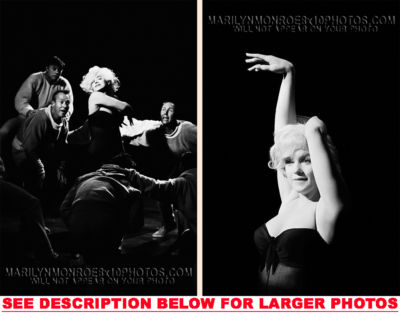 YOUARE PURCHASING 2 CANDID & RARE MARILYN MONROE MOVIE DANCE NUMBER (2) 8x10 FINE ART PHOTOS The (2) 8x10 Candid & Fine Art Photos you will receive, (shown below) are from a Private Collection. COPYRIGHTS: (please see bottom of thispage) These Candid, One of a kind pictures are Professionally photo-printed utilizing the GICLEE printing process onto GALERIE SmoothGloss Archival & Acid-free High Resolution Photo-Lab quality paper. As well, we use only Giclee pressheated Archival Printing Inks. This is Kodak's most expensive Ink, which creates higher & more vivid quality Photos & longer lasting prints than any other Photographic Ink in the world!! This Ultra Premium Kodak Super Color/Photo Gloss Pigment Based Printing Ink also shields photos from the key factors that lead to fading such as light, air, pollution, moisture and heat. This is due to the Spectacularly Innovative "colorlast" technology applied to this KodakPIGMENTInk, which allows your Photos to virtually resist any picture fading for at least 100 years. Meaning, the vibrant colors in the Photos you see below will be the exact same vibrant colors your descendants will see when viewing your Photos 100 years from now! NOTE PLEASE** WE ARE ALWAYS LISTING DIFFERENT MARILYN MONROE PHOTOS & PHOTO CREATIONS. IFYOU WOULD LIKE TO BE NOTIFIED THE NEXT TIME WE LIST MORE UNIQUE AND DIFFERENT PHOTOS OF MARILYN MONROE PLEASE EMAIL US  8x10 PHOTO#1 8x10 PHOTO#2 CLICK HERE TO VIEW MORE MARILYN MONROE 8x10PHOTOS!