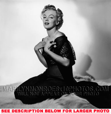YOU ARE PURCHASING 1 CANDID & RARE MARILYN MONROE NEGLIGEE ON A BEARUG (1) 8x10 FINE ART PHOTO The (1) 8x10 Candid & Fine Art Photo you will receive, (shown below) is from a Private Collection. COPYRIGHTS: (please see bottom of thispage) This Candid, One of a kind picture is Professionally photo-printed utilizing the GICLEE printing process onto GALERIE SmoothGloss Archival & Acid-free High Resolution Photo-Lab quality paper. As well, we use only Giclee pressheated Archival Printing Inks. This is Kodak's most expensive Ink, which creates higher & more vivid quality Photos & longer lasting prints than any other Photographic Ink in the world!! This Ultra Premium Kodak Super Color/Photo Gloss Pigment Based Printing Ink also shields photos from the key factors that lead to fading such as light, air, pollution, moisture and heat. This is due to the Spectacularly Innovative "colorlast" technology applied to this KodakPIGMENTInk, which allows your Photo to virtually resist any picture fading for at least 100 years. Meaning, the vibrant colors in the Photo you see below will be the exact same vibrant colors your descendants will see when viewing your Photo 100 years from now! NOTE PLEASE** WE ARE ALWAYS LISTING DIFFERENT MARILYN MONROE PHOTOS & PHOTO CREATIONS. IFYOU WOULD LIKE TO BE NOTIFIED THE NEXT TIME WE LIST MORE UNIQUE AND DIFFERENT PHOTOS OF MARILYN MONROE PLEASE EMAIL US  8x10 PHOTO#1 CLICK HERE TO VIEW MORE MARILYN MONROE 8x10PHOTOS!