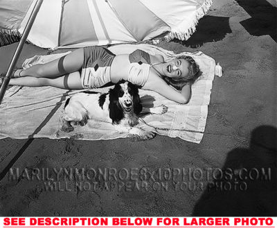 YOU ARE PURCHASING 1 CANDID & RARE MARILYN MONROE Norma Jeane wBeachDog (1) 8x10 FINE ART PHOTO The (1) 8x10 Candid & Fine Art Photo you will receive, (shown below) is from a Private Collection. COPYRIGHTS: (please see bottom of thispage) This Candid, One of a kind picture is Professionally photo-printed utilizing the GICLEE printing process onto GALERIE SmoothGloss Archival & Acid-free High Resolution Photo-Lab quality paper. As well, we use only Giclee pressheated Archival Printing Inks. This is Kodak's most expensive Ink, which creates higher & more vivid quality Photos & longer lasting prints than any other Photographic Ink in the world!! This Ultra Premium Kodak Super Color/Photo Gloss Pigment Based Printing Ink also shields photos from the key factors that lead to fading such as light, air, pollution, moisture and heat. This is due to the Spectacularly Innovative "colorlast" technology applied to this KodakPIGMENTInk, which allows your Photo to virtually resist any picture fading for at least 100 years. Meaning, the vibrant colors in the Photo you see below will be the exact same vibrant colors your descendants will see when viewing your Photo 100 years from now! NOTE PLEASE** WE ARE ALWAYS LISTING DIFFERENT MARILYN MONROE PHOTOS & PHOTO CREATIONS. IFYOU WOULD LIKE TO BE NOTIFIED THE NEXT TIME WE LIST MORE UNIQUE AND DIFFERENT PHOTOS OF MARILYN MONROE PLEASE EMAIL US  8x10 PHOTO#1 CLICK HERE TO VIEW MORE MARILYN MONROE 8x10PHOTOS!