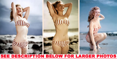 YOU ARE PURCHASING 3 CANDID & RARE MARILYN MONROE NORMAJEAN AT THE BEACH (3) 8x10 FINE ART PHOTOS The (3) 8x10 Candid & Fine Art Photos you will receive, (shown below) are from a Private Collection. COPYRIGHTS: (please see bottom of thispage) These Candid, One of a kind pictures are Professionally photo-printed utilizing the GICLEE printing process onto GALERIE SmoothGloss Archival & Acid-free High Resolution Photo-Lab quality paper. As well, we use only Giclee pressheated Archival Printing Inks. This is Kodak's most expensive Ink, which creates higher & more vivid quality Photos & longer lasting prints than any other Photographic Ink in the world!! This Ultra Premium Kodak Super Color/Photo Gloss Pigment Based Printing Ink also shields photos from the key factors that lead to fading such as light, air, pollution, moisture and heat. This is due to the Spectacularly Innovative "colorlast" technology applied to this KodakPIGMENTInk, which allows your Photos to virtually resist any picture fading for at least 100 years. Meaning, the vibrant colors in the Photos you see below will be the exact same vibrant colors your descendants will see when viewing your Photos 100 years from now! NOTE PLEASE** WE ARE ALWAYS LISTING DIFFERENT MARILYN MONROE PHOTOS & PHOTO CREATIONS. IFYOU WOULD LIKE TO BE NOTIFIED THE NEXT TIME WE LIST MORE UNIQUE AND DIFFERENT PHOTOS OF MARILYN MONROE PLEASE EMAIL US  8x10 PHOTO#1 8x10 PHOTO#2 8x10 PHOTO#3 CLICK HERE TO VIEW MORE MARILYN MONROE 8x10PHOTOS!
