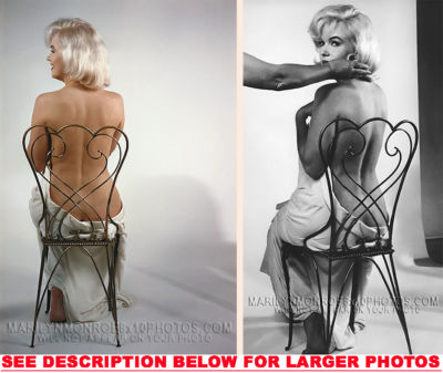 YOUARE PURCHASING 2 CANDID & RARE MARILYN MONROE NUDE on CHAIR SHOOT (2) 8x10 FINE ART PHOTOS The (2) 8x10 Candid & Fine Art Photos you will receive, (shown below) are from a Private Collection. COPYRIGHTS: (please see bottom of thispage) These Candid, One of a kind pictures are Professionally photo-printed utilizing the GICLEE printing process onto GALERIE SmoothGloss Archival & Acid-free High Resolution Photo-Lab quality paper. As well, we use only Giclee pressheated Archival Printing Inks. This is Kodak's most expensive Ink, which creates higher & more vivid quality Photos & longer lasting prints than any other Photographic Ink in the world!! This Ultra Premium Kodak Super Color/Photo Gloss Pigment Based Printing Ink also shields photos from the key factors that lead to fading such as light, air, pollution, moisture and heat. This is due to the Spectacularly Innovative "colorlast" technology applied to this KodakPIGMENTInk, which allows your Photos to virtually resist any picture fading for at least 100 years. Meaning, the vibrant colors in the Photos you see below will be the exact same vibrant colors your descendants will see when viewing your Photos 100 years from now! NOTE PLEASE** WE ARE ALWAYS LISTING DIFFERENT MARILYN MONROE PHOTOS & PHOTO CREATIONS. IFYOU WOULD LIKE TO BE NOTIFIED THE NEXT TIME WE LIST MORE UNIQUE AND DIFFERENT PHOTOS OF MARILYN MONROE PLEASE EMAIL US  8x10 PHOTO#1 8x10 PHOTO#2 CLICK HERE TO VIEW MORE MARILYN MONROE 8x10PHOTOS!