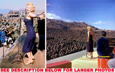 YOUARE PURCHASING 2 CANDID & RARE MARILYN MONROE On Stage in KOREA (2) 8x10 FINE ART PHOTOS The (2) 8x10 Candid & Fine Art Photos you will receive, (shown below) are from a Private Collection. COPYRIGHTS: (please see bottom of thispage) These Candid, One of a kind pictures are Professionally photo-printed utilizing the GICLEE printing process onto GALERIE SmoothGloss Archival & Acid-free High Resolution Photo-Lab quality paper. As well, we use only Giclee pressheated Archival Printing Inks. This is Kodak's most expensive Ink, which creates higher & more vivid quality Photos & longer lasting prints than any other Photographic Ink in the world!! This Ultra Premium Kodak Super Color/Photo Gloss Pigment Based Printing Ink also shields photos from the key factors that lead to fading such as light, air, pollution, moisture and heat. This is due to the Spectacularly Innovative "colorlast" technology applied to this KodakPIGMENTInk, which allows your Photos to virtually resist any picture fading for at least 100 years. Meaning, the vibrant colors in the Photos you see below will be the exact same vibrant colors your descendants will see when viewing your Photos 100 years from now! NOTE PLEASE** WE ARE ALWAYS LISTING DIFFERENT MARILYN MONROE PHOTOS & PHOTO CREATIONS. IFYOU WOULD LIKE TO BE NOTIFIED THE NEXT TIME WE LIST MORE UNIQUE AND DIFFERENT PHOTOS OF MARILYN MONROE PLEASE EMAIL US  8x10 PHOTO#1 8x10 PHOTO#2 CLICK HERE TO VIEW MORE MARILYN MONROE 8x10PHOTOS!